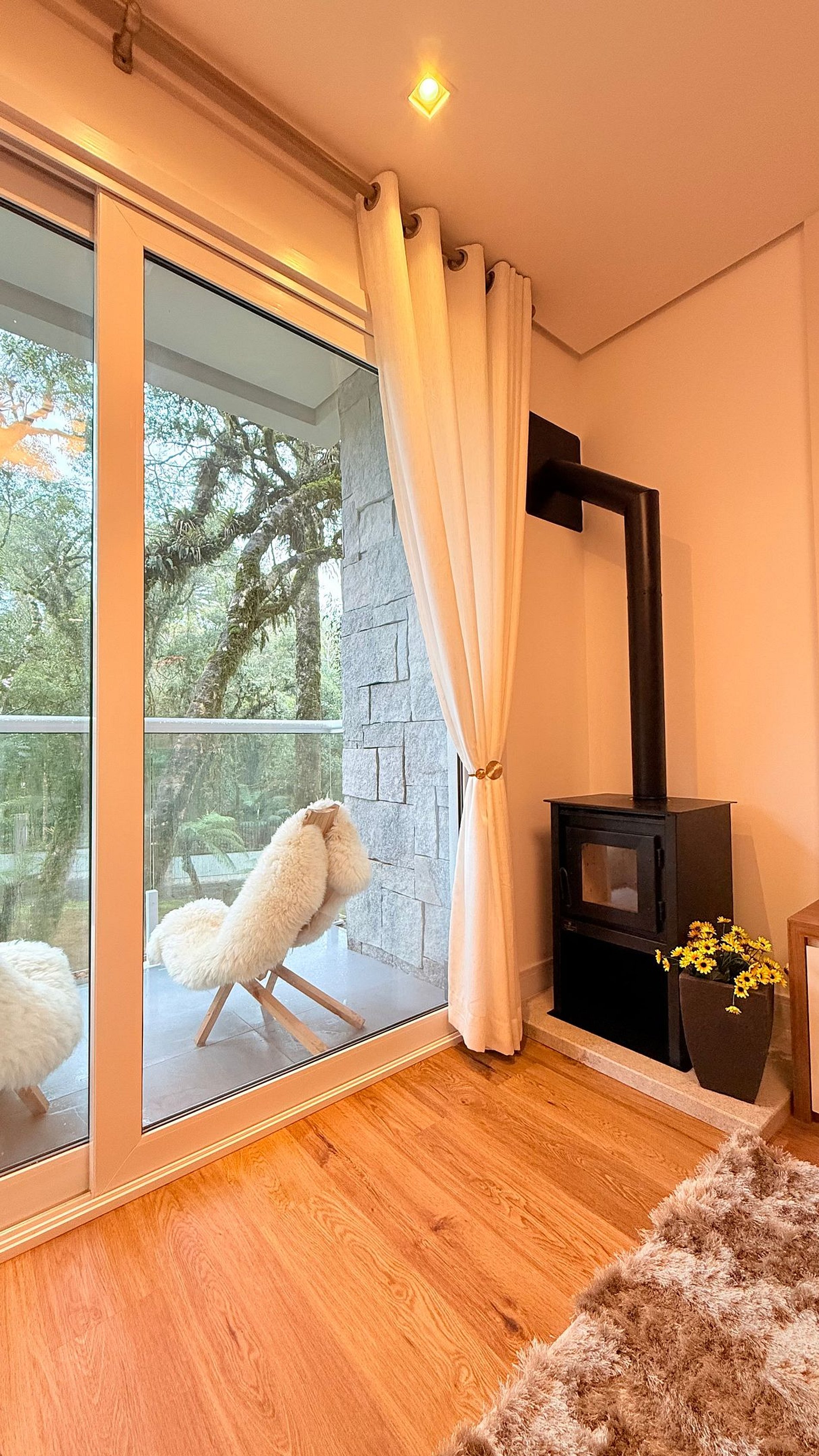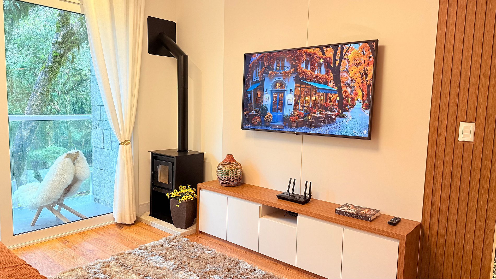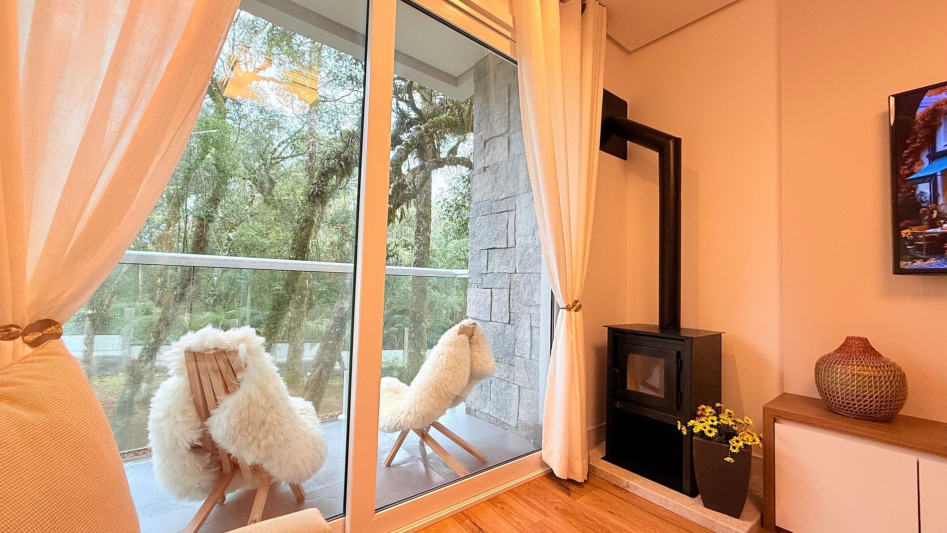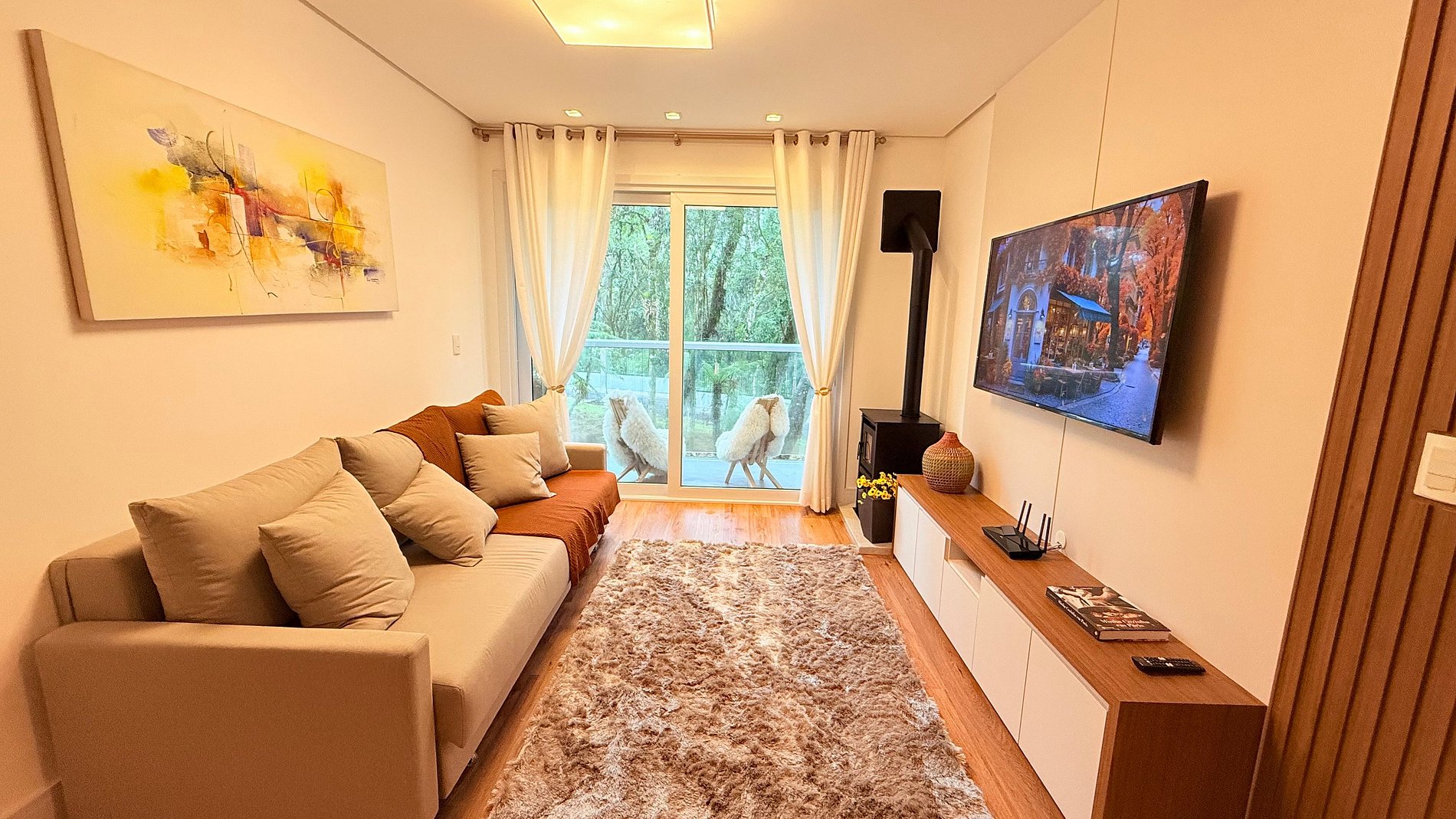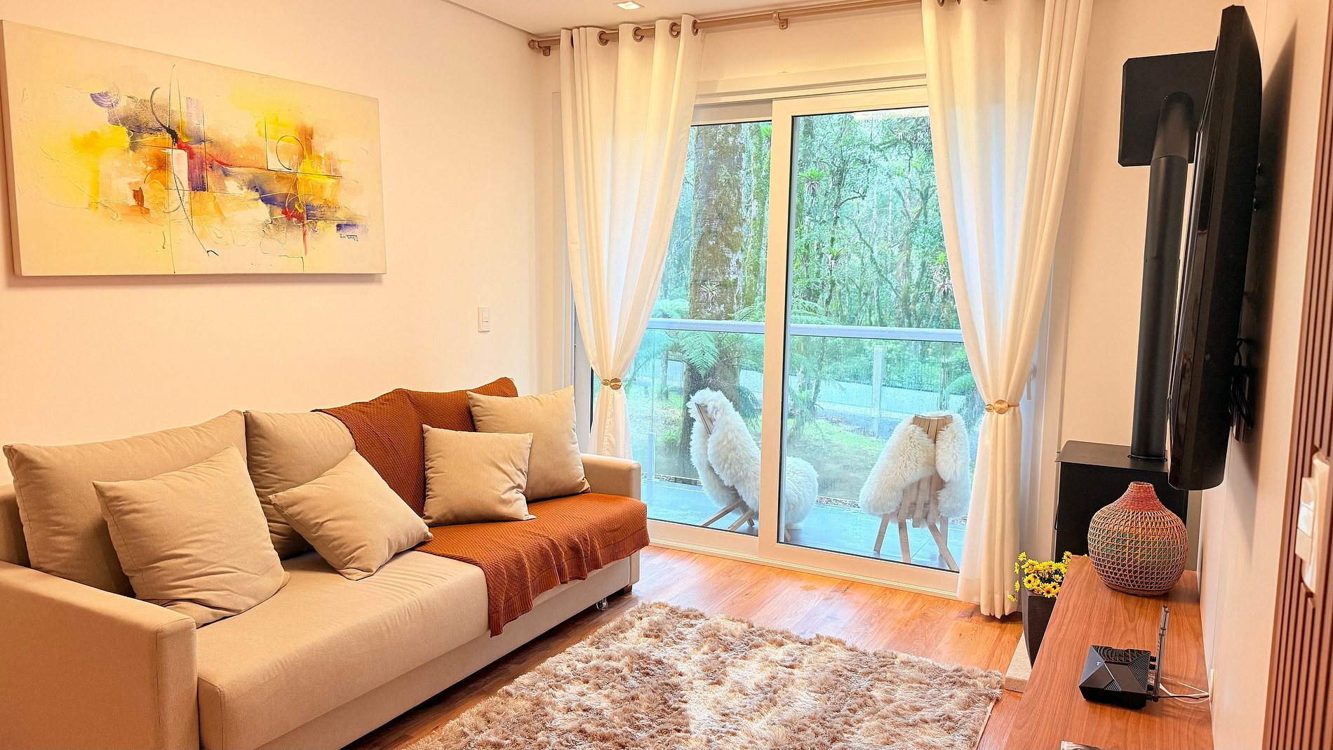Esse apê é um refúgio perfeito em meio à natureza de Gramado. A ampla varanda com vista para o verde convida a momentos de paz e contemplação. A lareira e o sofá-cama tornam a sala ainda mais acolhedora. A suíte é confortável e climatizada, com cama queen e ar-condicionado. Tudo foi pensado para unir conforto, praticidade e beleza — dentro de um condomínio clube com lazer completo, ideal para todas as idades.