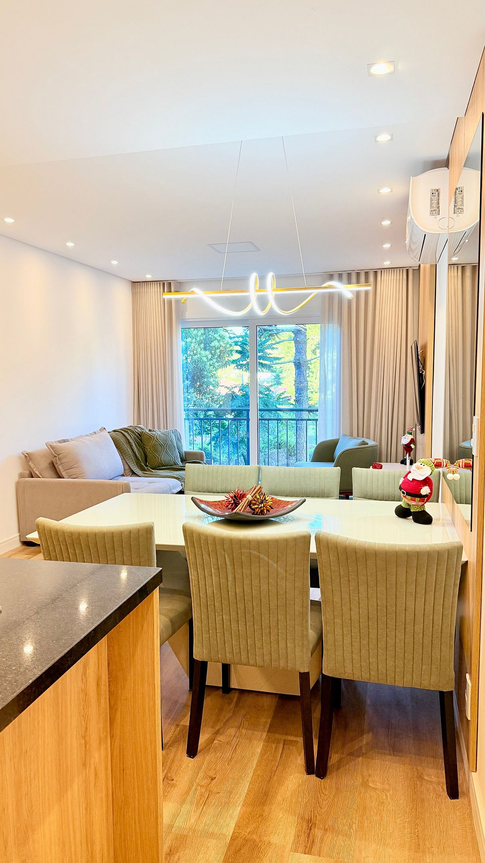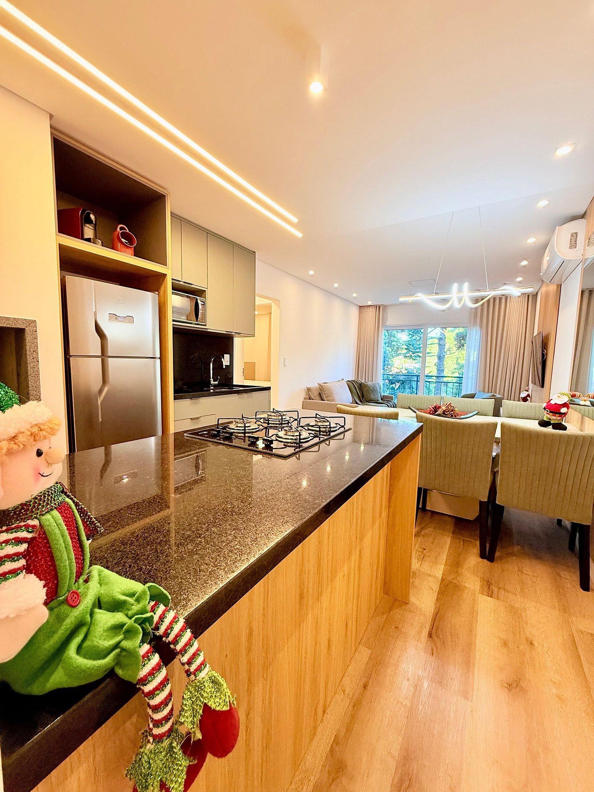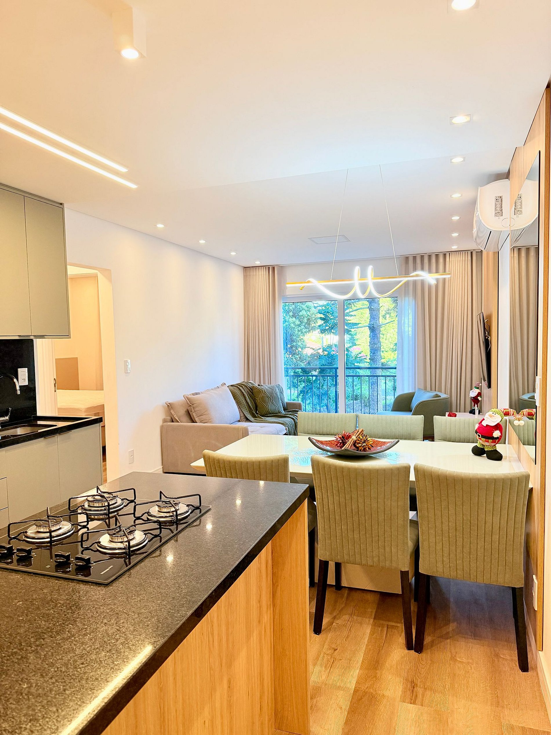 Apartamento novo, lindo e muito bem decorado, localizado a apenas 600 metros da Catedral de Pedra, em Canela. Possui duas suítes com camas queen e camas auxiliares, sala de estar com sofá-cama, lavabo e ar-condicionado em todos os ambientes. Vista encantadora para o jardim, ideal para famílias e grupos que buscam conforto, praticidade e uma estadia especial na Serra Gaúcha.