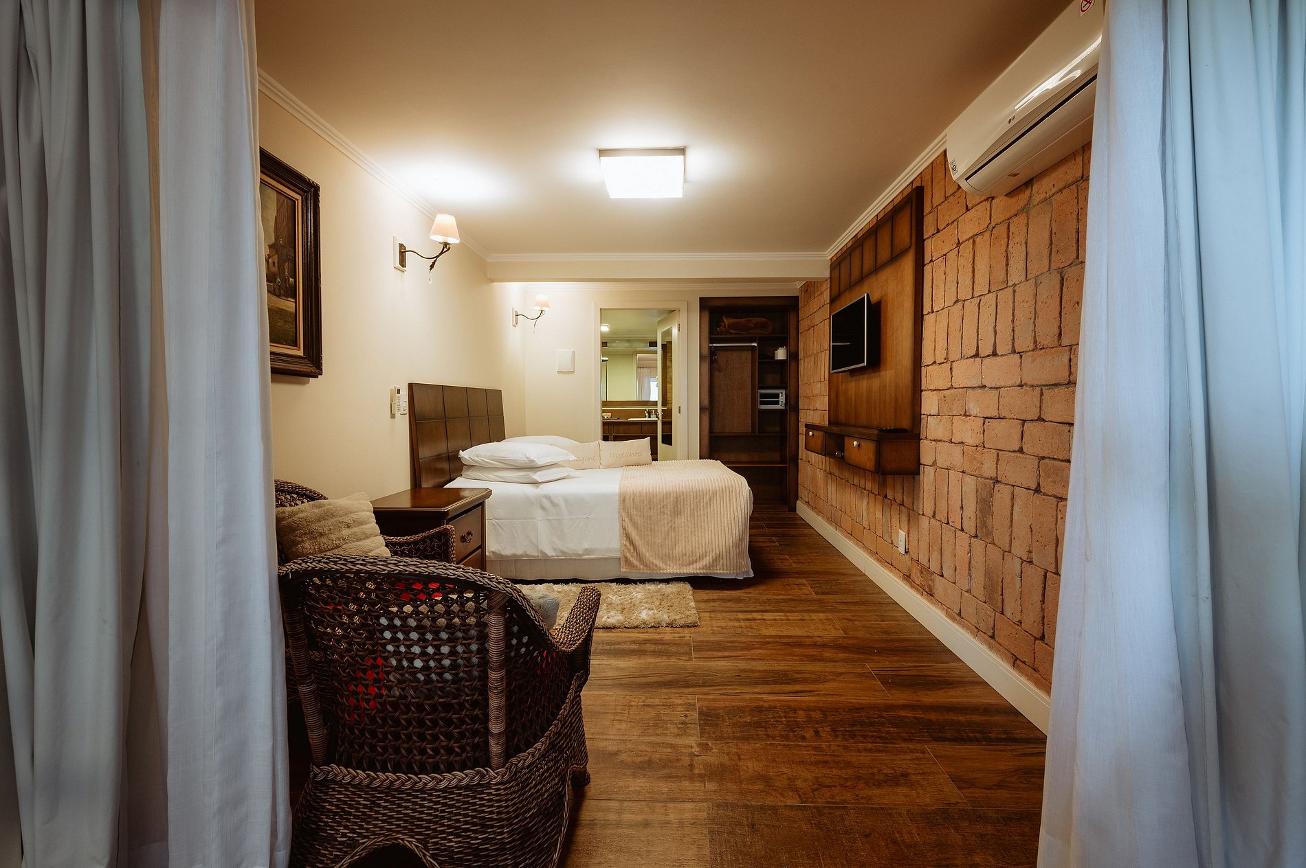 Com um estilo mais natural e aconchegante, a Suíte Rústica traz a essência da Serra em seus detalhes. Possui cama de casal e um clima acolhedor, perfeito para relaxar.