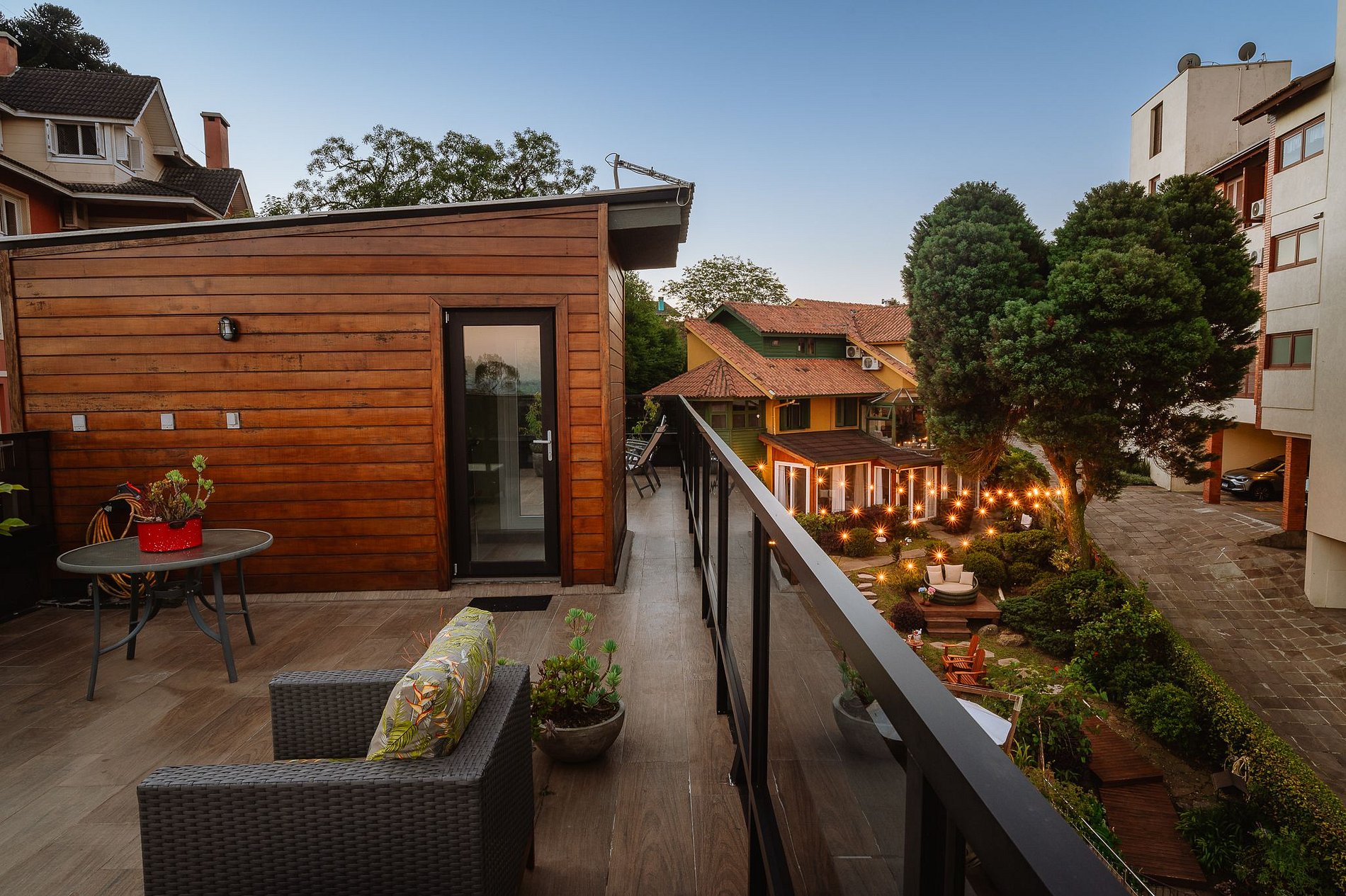 O grande destaque fica por conta do rooftop com jardim, um verdadeiro convite para relaxar. De lá, você desfruta de uma vista deslumbrante para o vale, cenário perfeito para apreciar o nascer do sol, um bom chimarrão ao entardecer ou simplesmente contemplar a natureza.