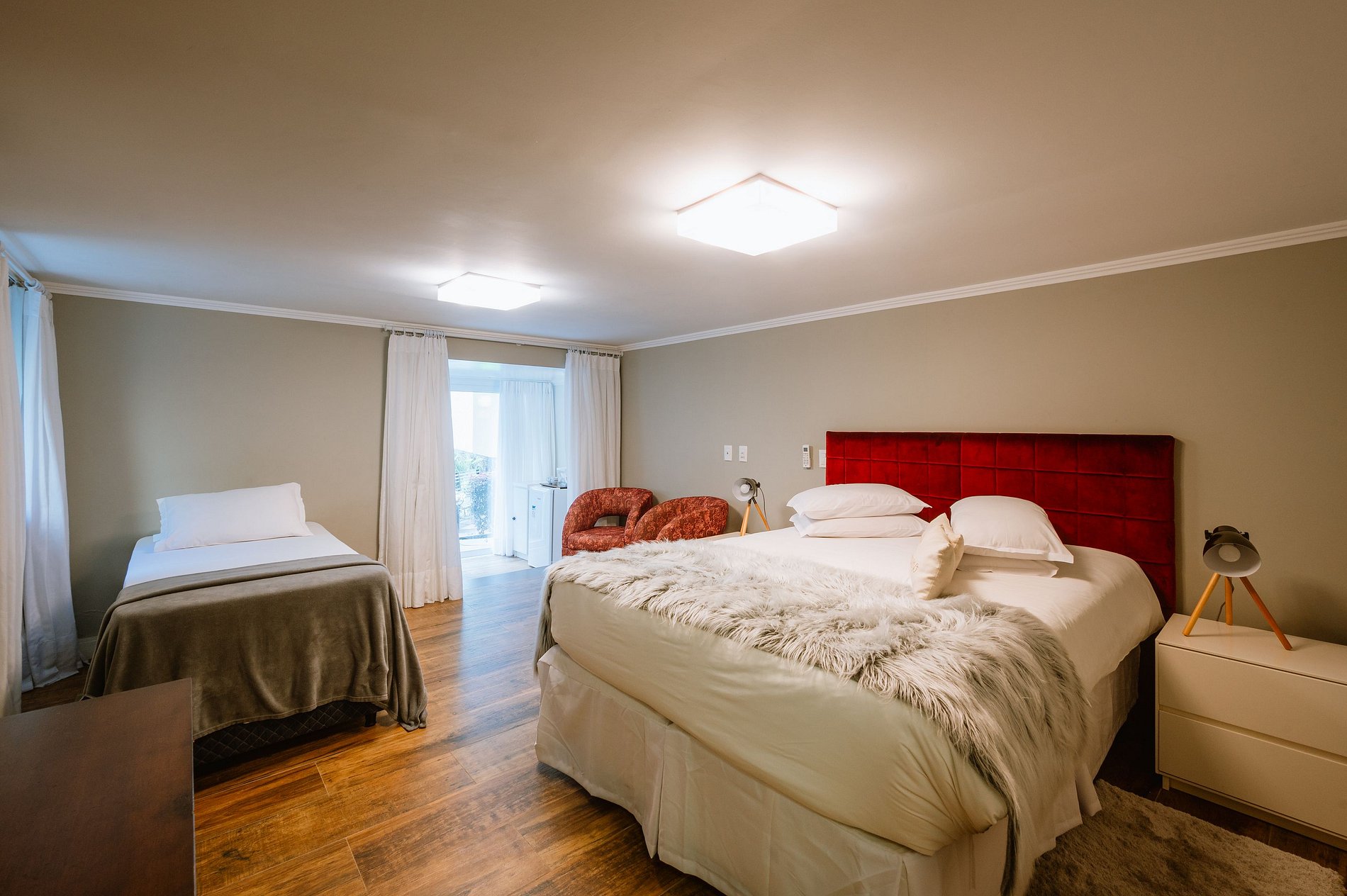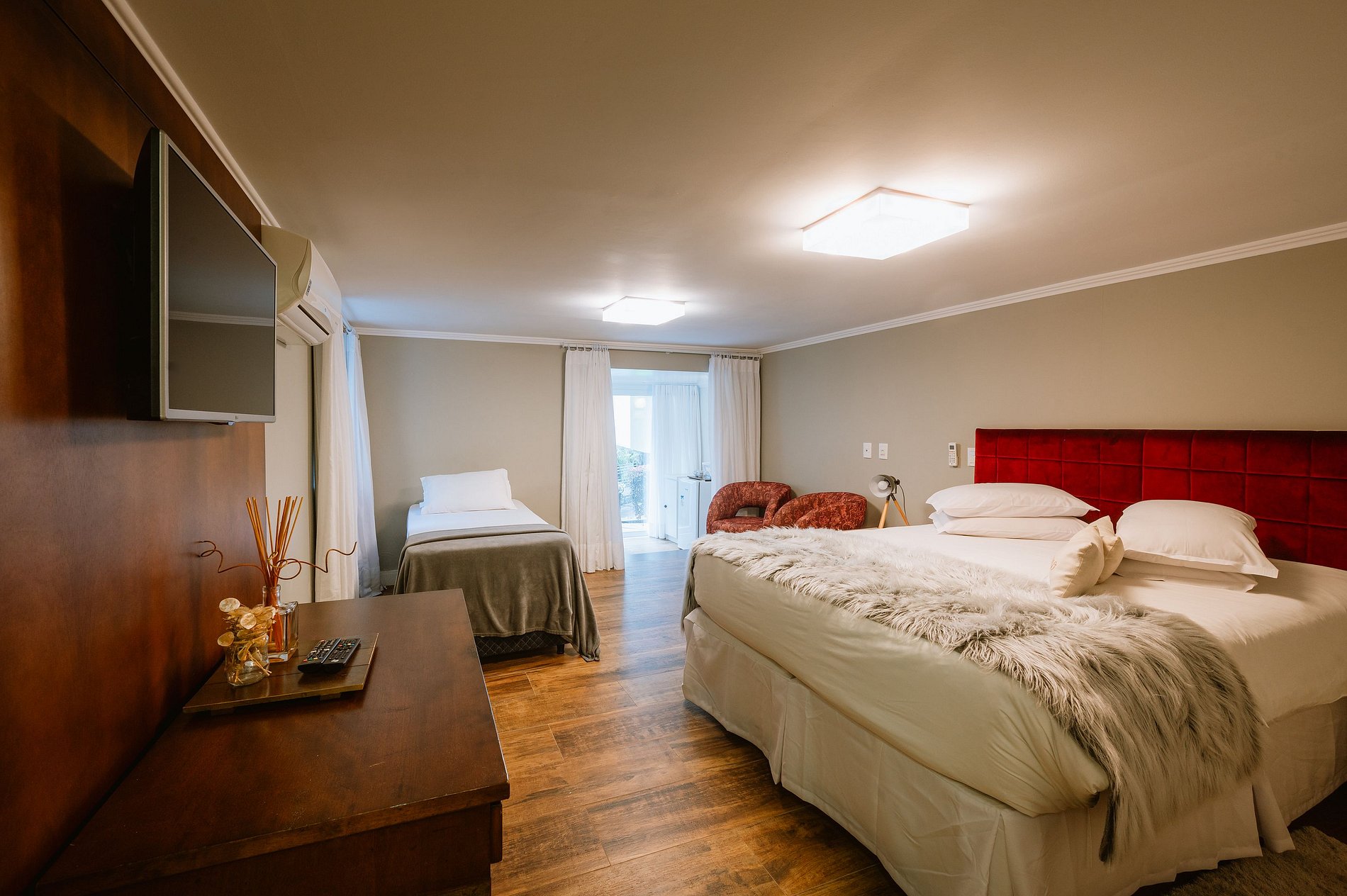 Ampla e versátil, a Suíte Contemporânea é ideal para famílias ou grupos. Conta com cama queen + 2 camas de solteiro, oferecendo conforto e praticidade em um ambiente moderno.
