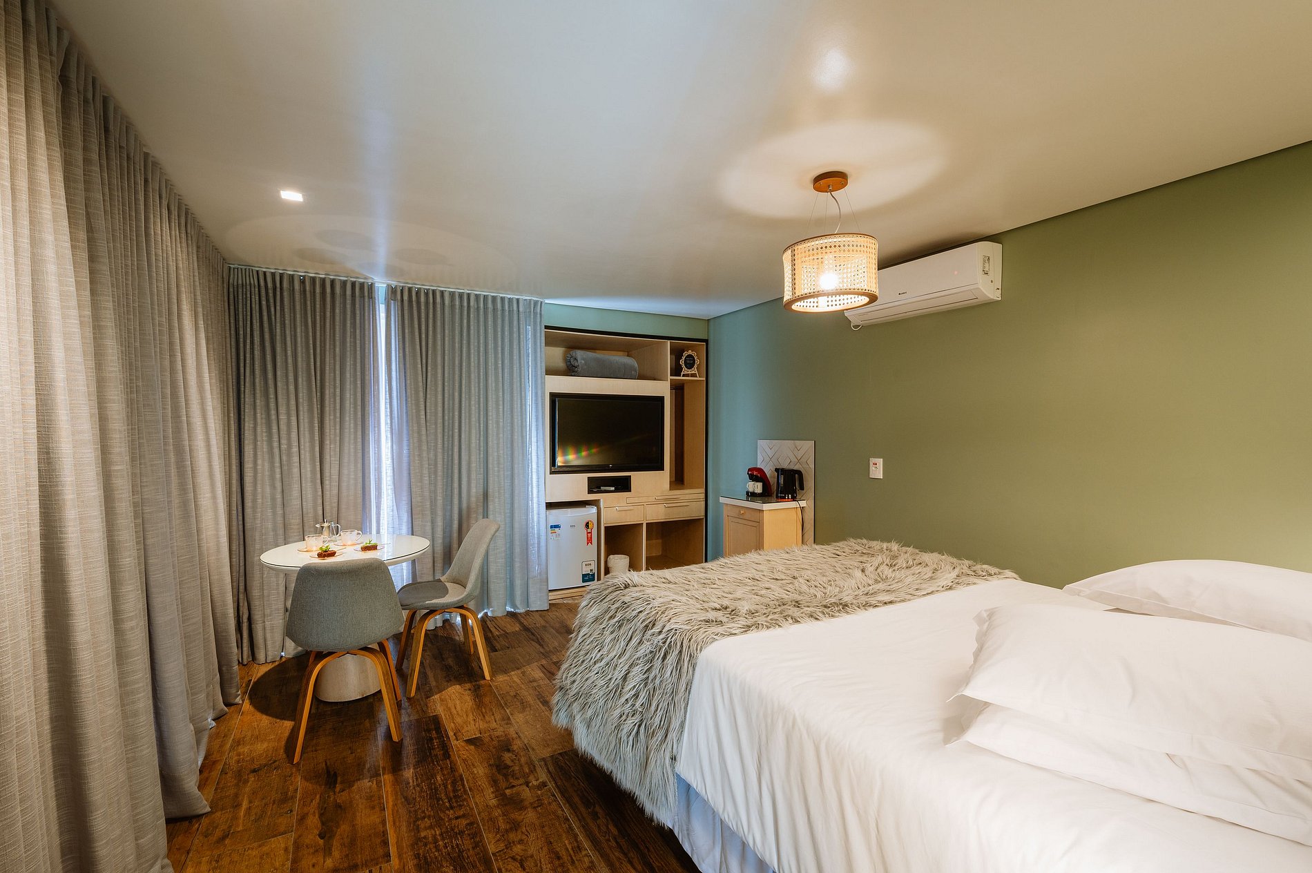 Todas as suítes são equipadas com toalhas, chaleira, cafeteira, ferro de passar, secador de cabelo, além de mesa e cadeira para maior comodidade.