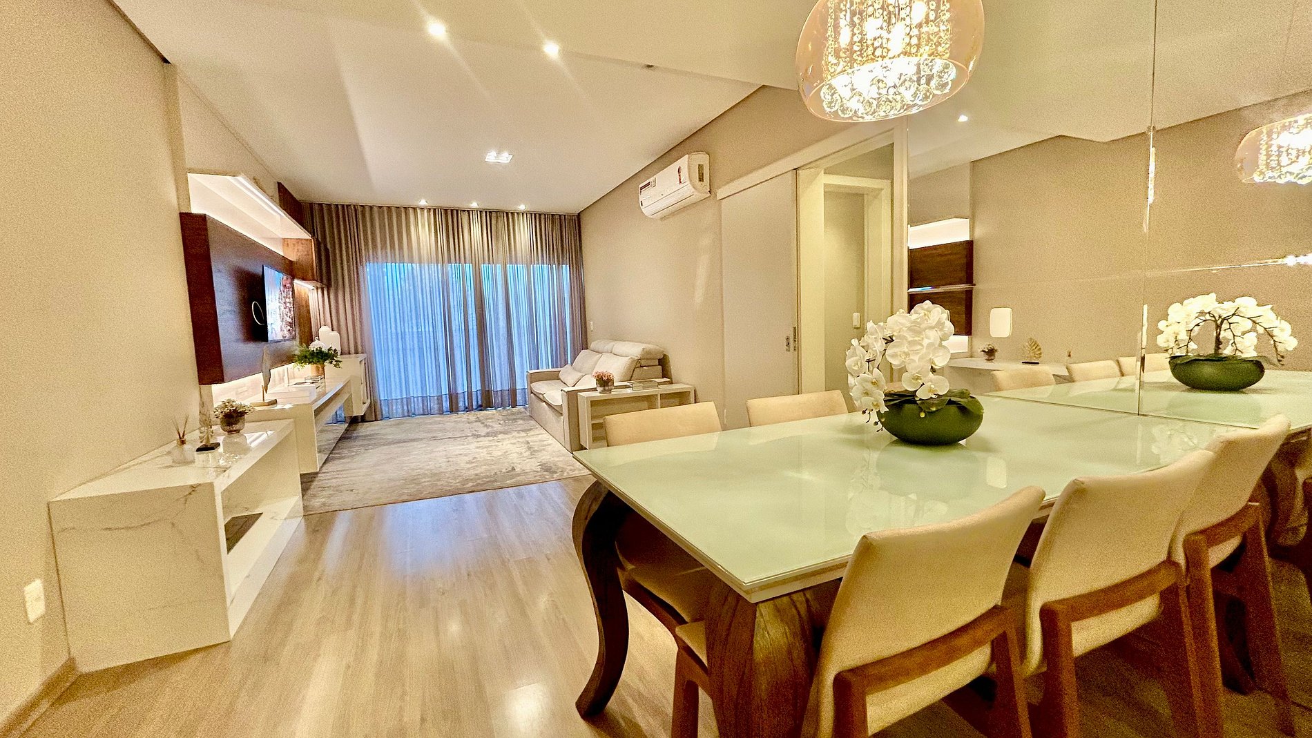 Esse apartamento é espaçoso e acomoda confortavelmente até sete pessoas. São duas suítes, uma com cama de casal tamanho queen e a segunda suíte com cama de casal tamanho padrão. Além disso possui um sofá cama confortável que acomoda mais duas pessoas. O apartamento está totalmente equipado com itens essenciais como louças, roupas de cama e banho, microondas, forno, cafeteira, sanduicheira, secador de cabelo e etc… Aqui, você não precisa se preocupar em carregar todos esses itens extras, pois nós pensamos em tudo! Possui ainda ar-condicionado quente e frio em todos os cômodos principais.