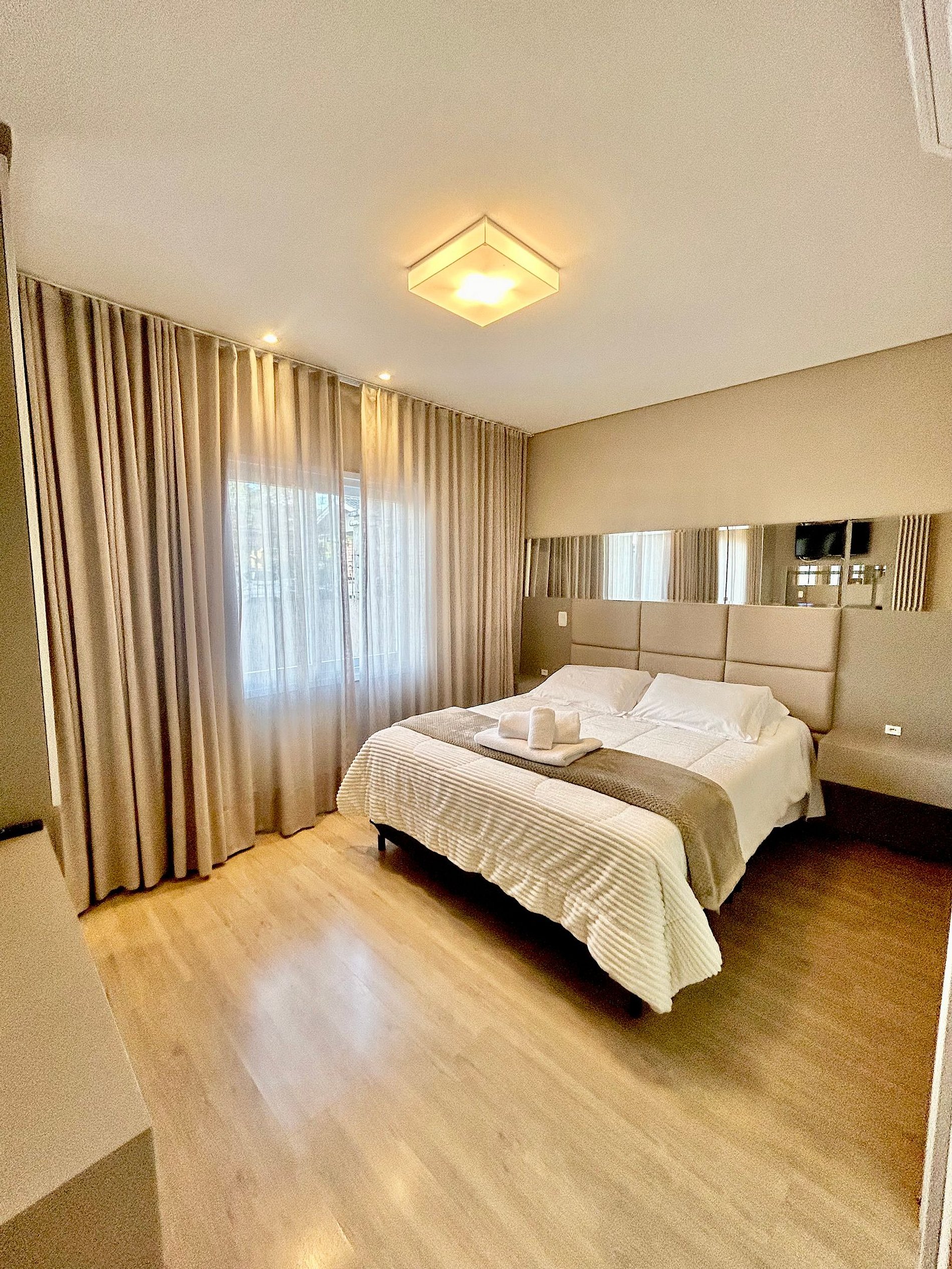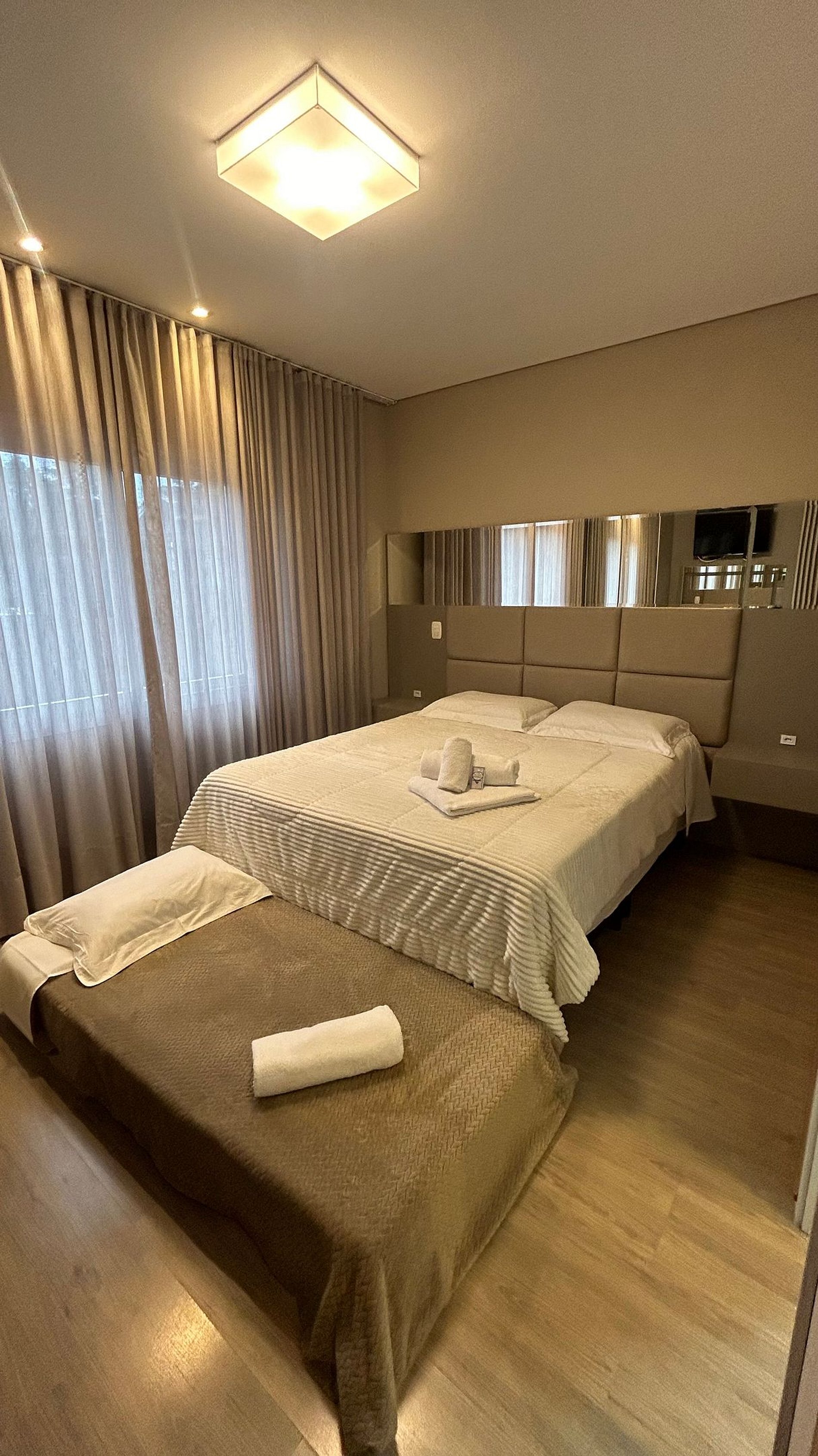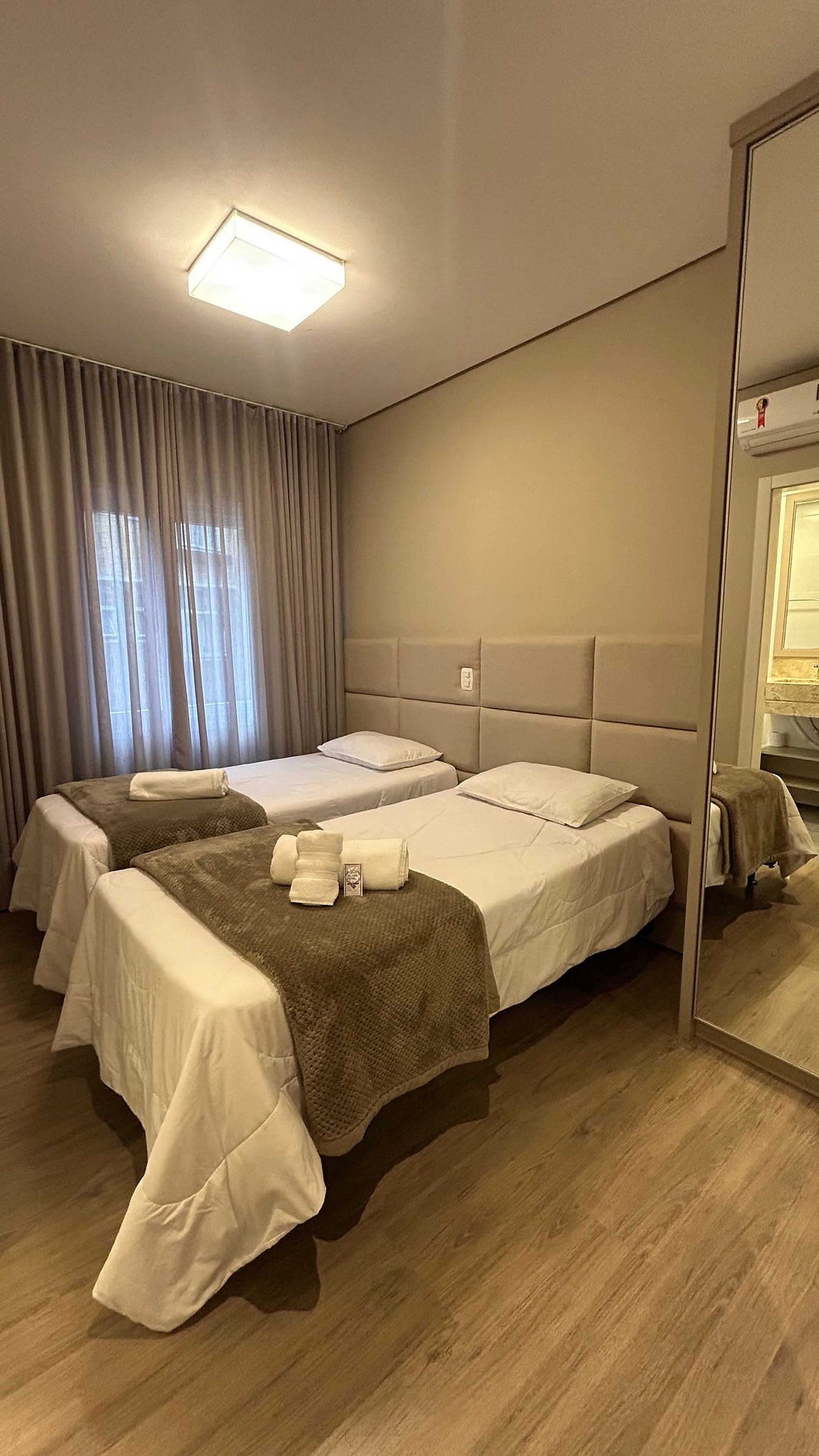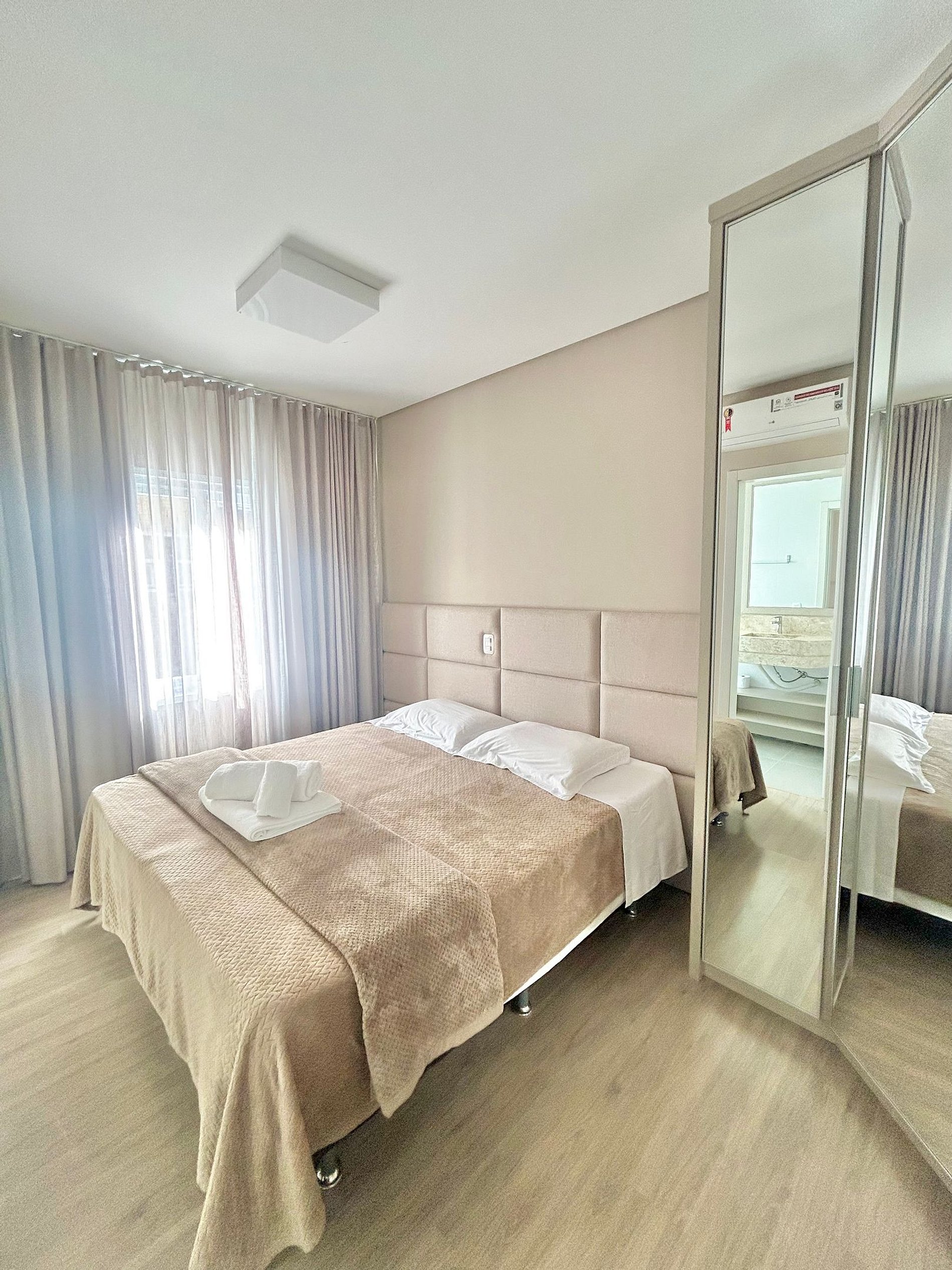 Esse apartamento é espaçoso e acomoda confortavelmente até seis pessoas. São duas suítes, ambas com cama de casal tamanho queen sendo que uma delas pode separar e montar duas de solteiro além de uma das suítes contar com uma cama auxiliar. Possui ainda um sofá cama confortável que acomoda mais duas pessoas. O apartamento está totalmente equipado com itens essenciais como louças, roupas de cama e banho, máquina lava e seca, microondas, forno, cafeteira, sanduicheira, secador de cabelo e etc… Aqui, você não precisa se preocupar em carregar todos esses itens extras, pois nós pensamos em tudo! Possui ainda ar-condicionado quente e frio em todos os cômodos principais.