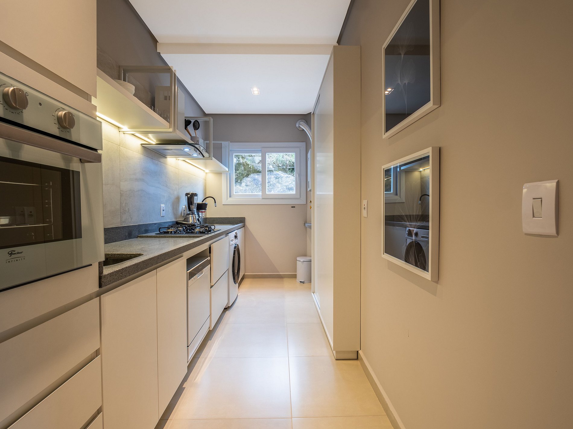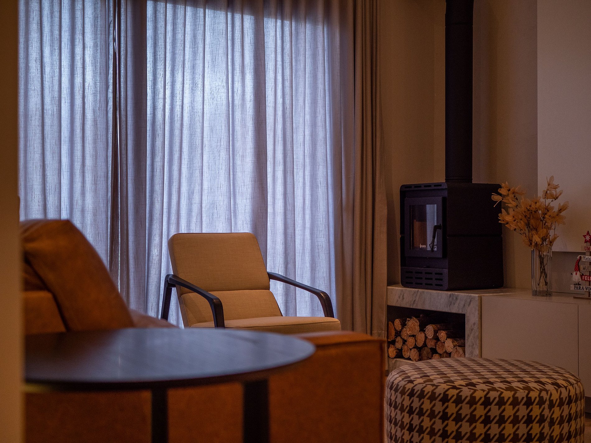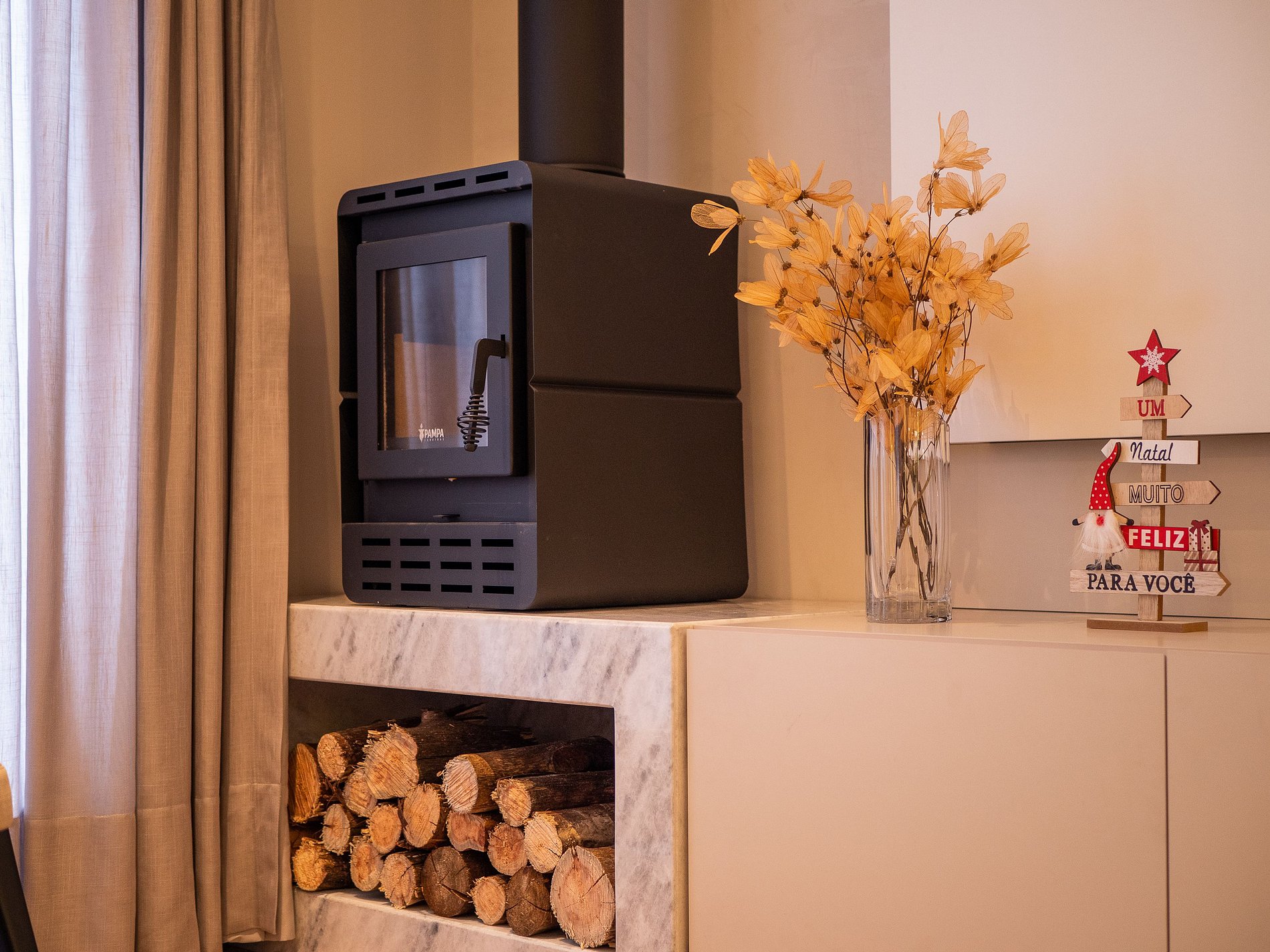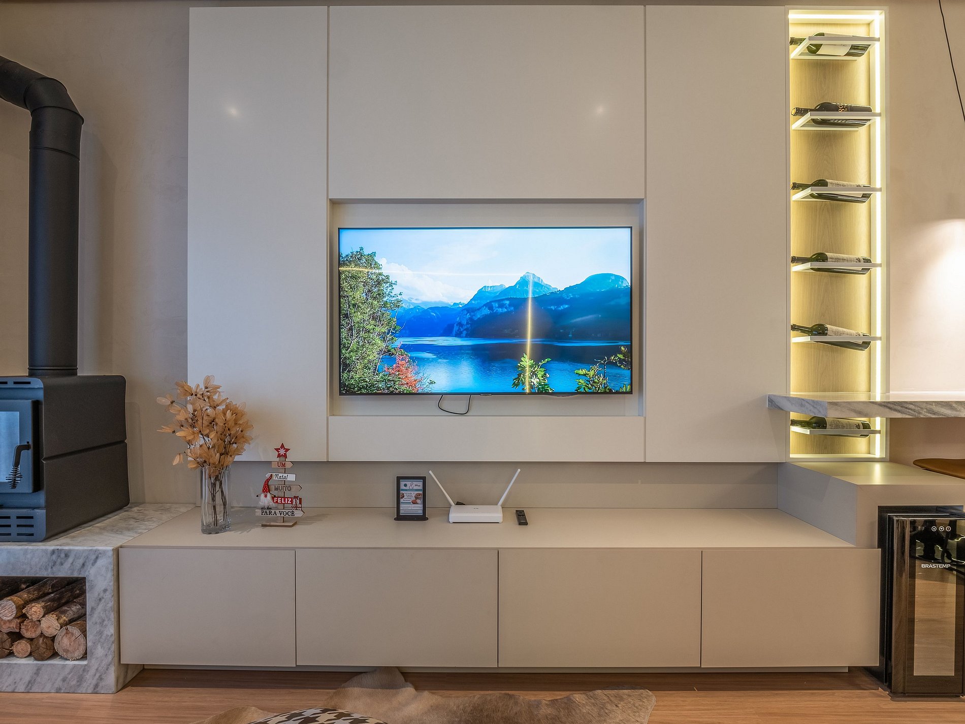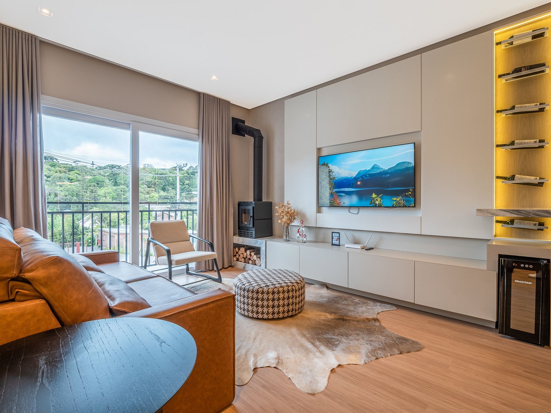 A lareira na sala cria uma atmosfera perfeita para os dias frios de Gramado — ideal para um vinho à noite, um bom livro ou um tempo de qualidade em família. A cozinha é completa, com utensílios de excelente qualidade e itens para churrasco, oferecendo liberdade e praticidade durante a estadia.