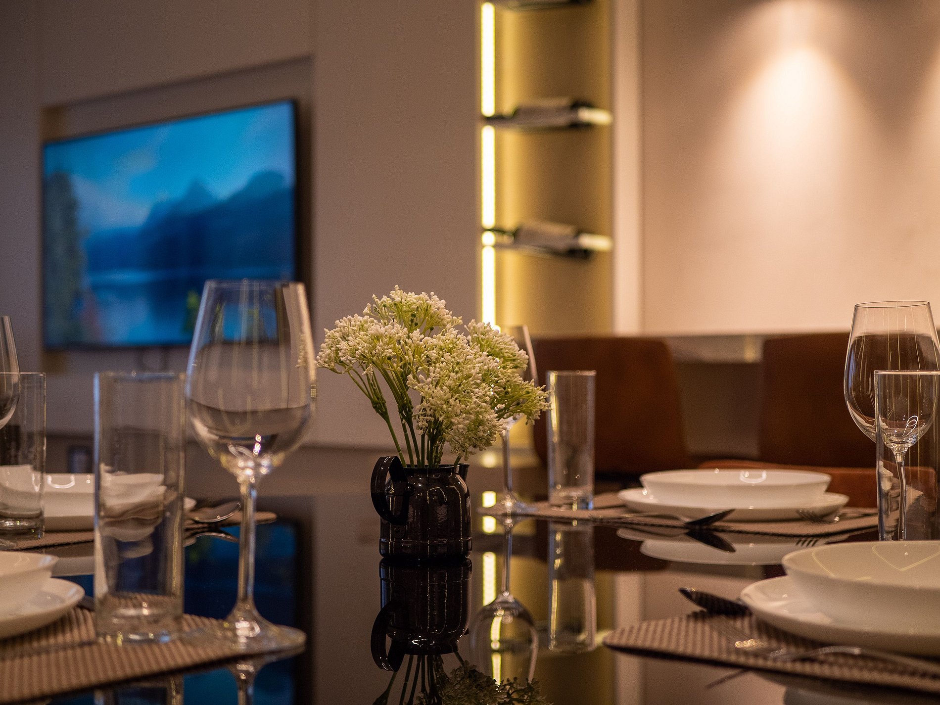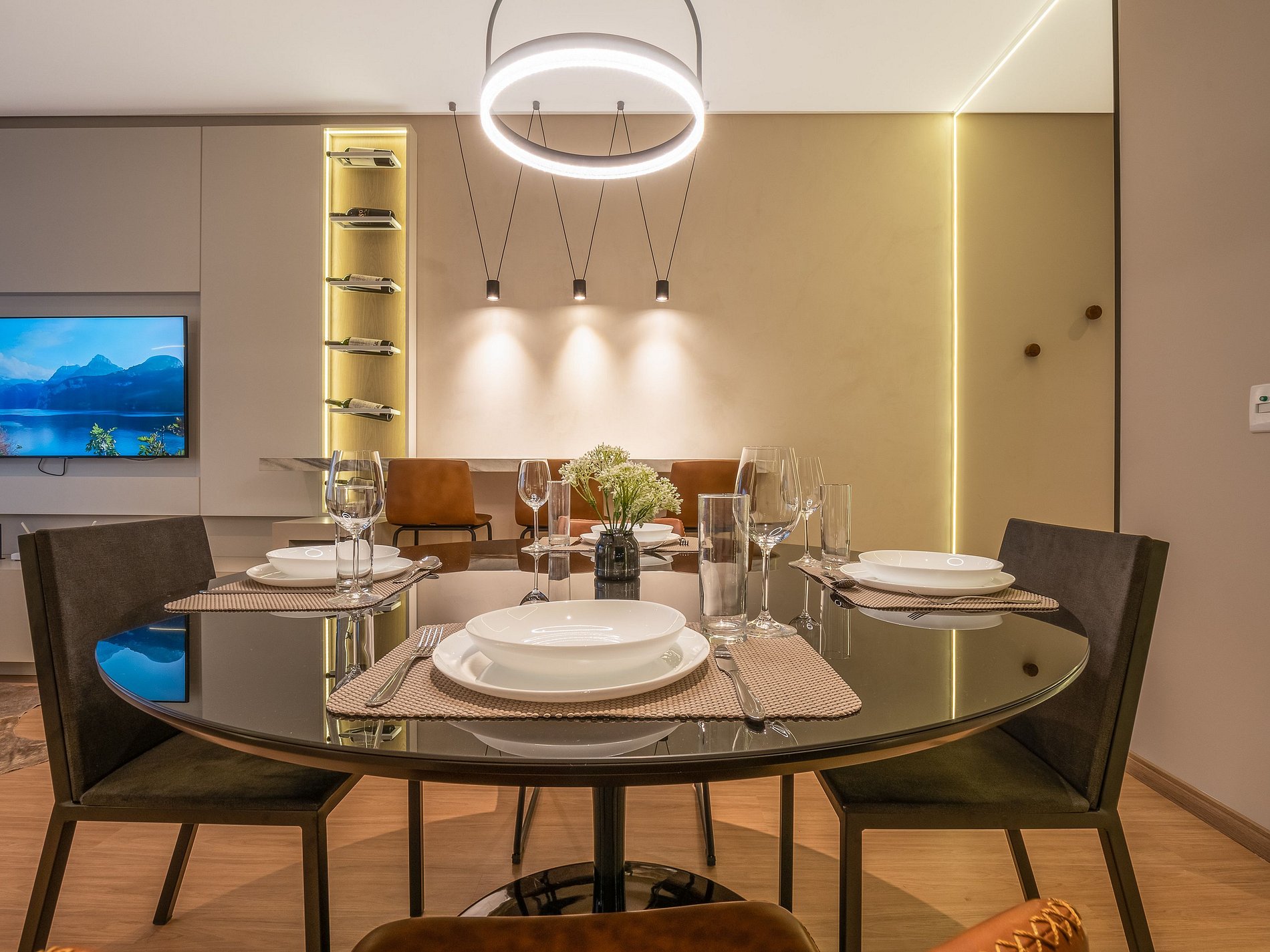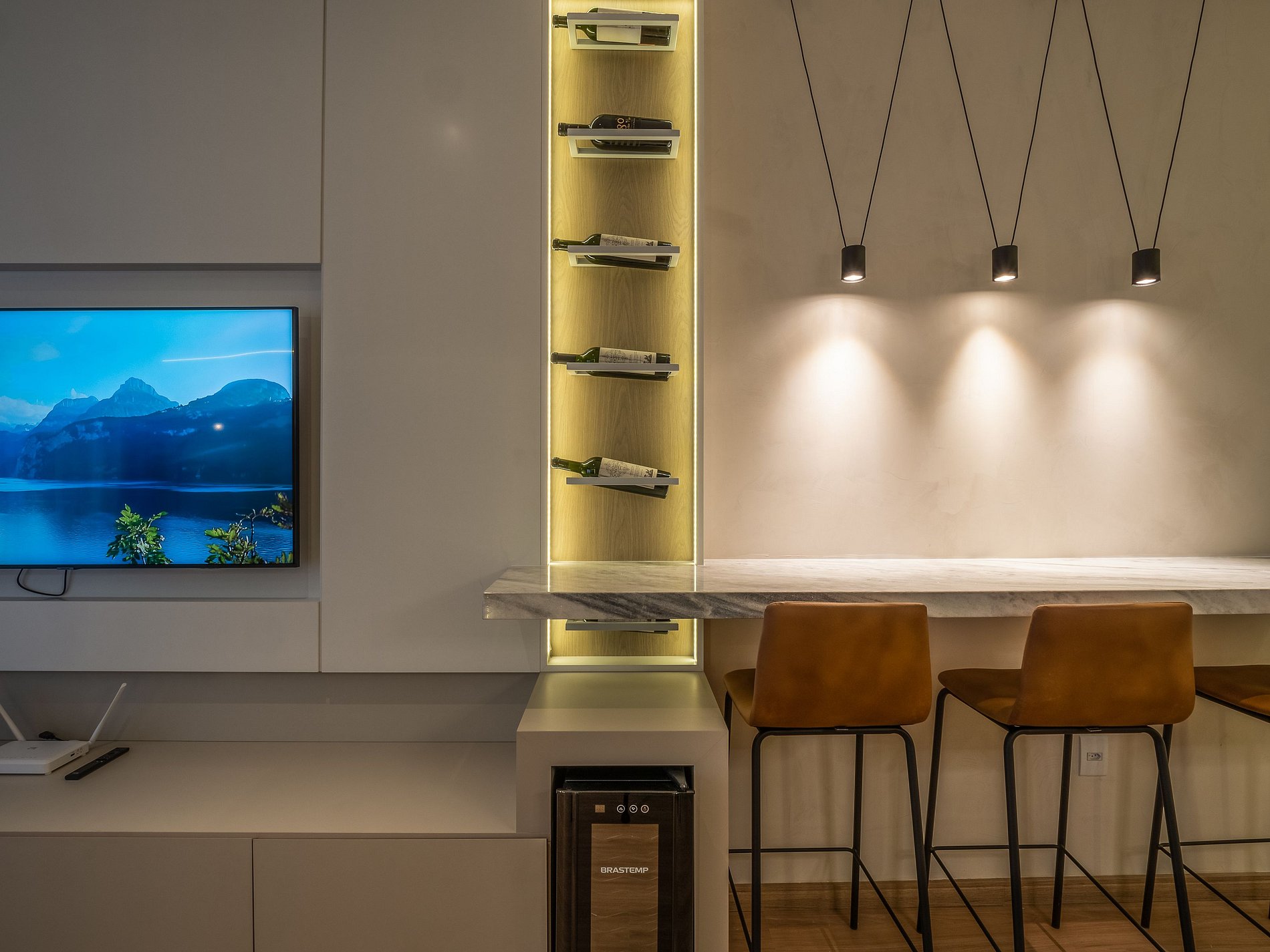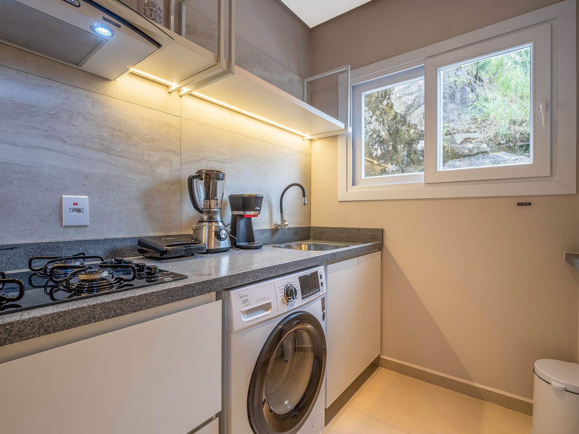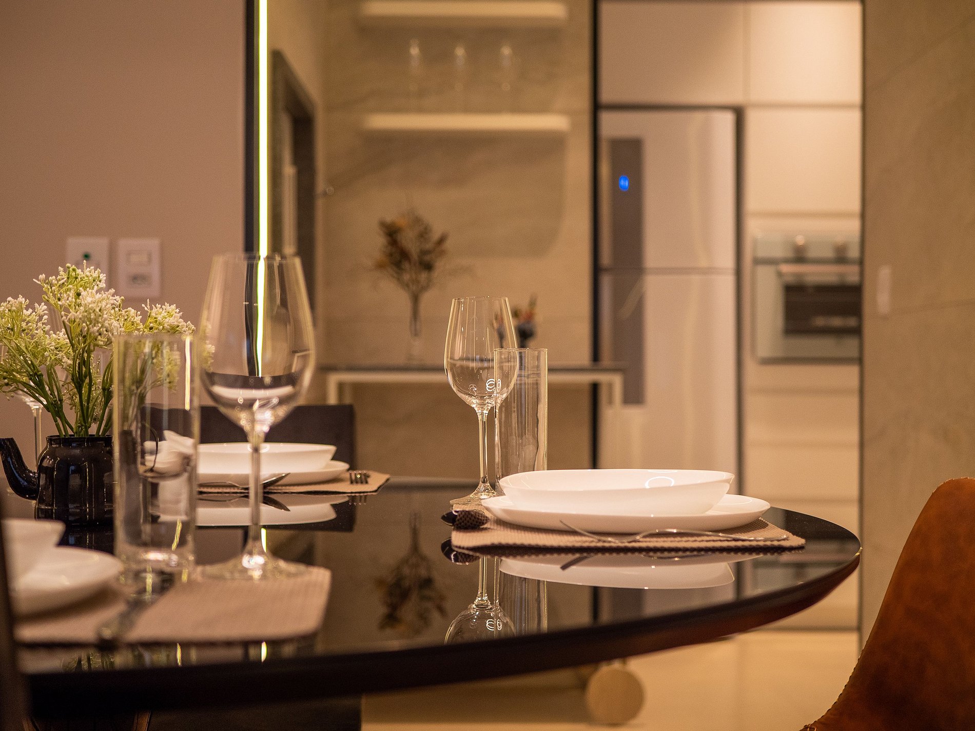 A lareira na sala cria uma atmosfera perfeita para os dias frios de Gramado — ideal para um vinho à noite, um bom livro ou um tempo de qualidade em família. A cozinha é completa, com utensílios de excelente qualidade e itens para churrasco, oferecendo liberdade e praticidade durante a estadia.